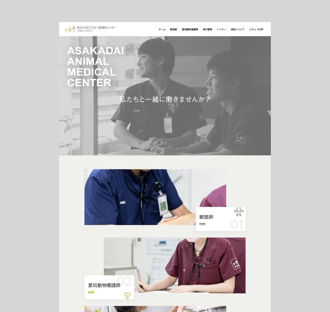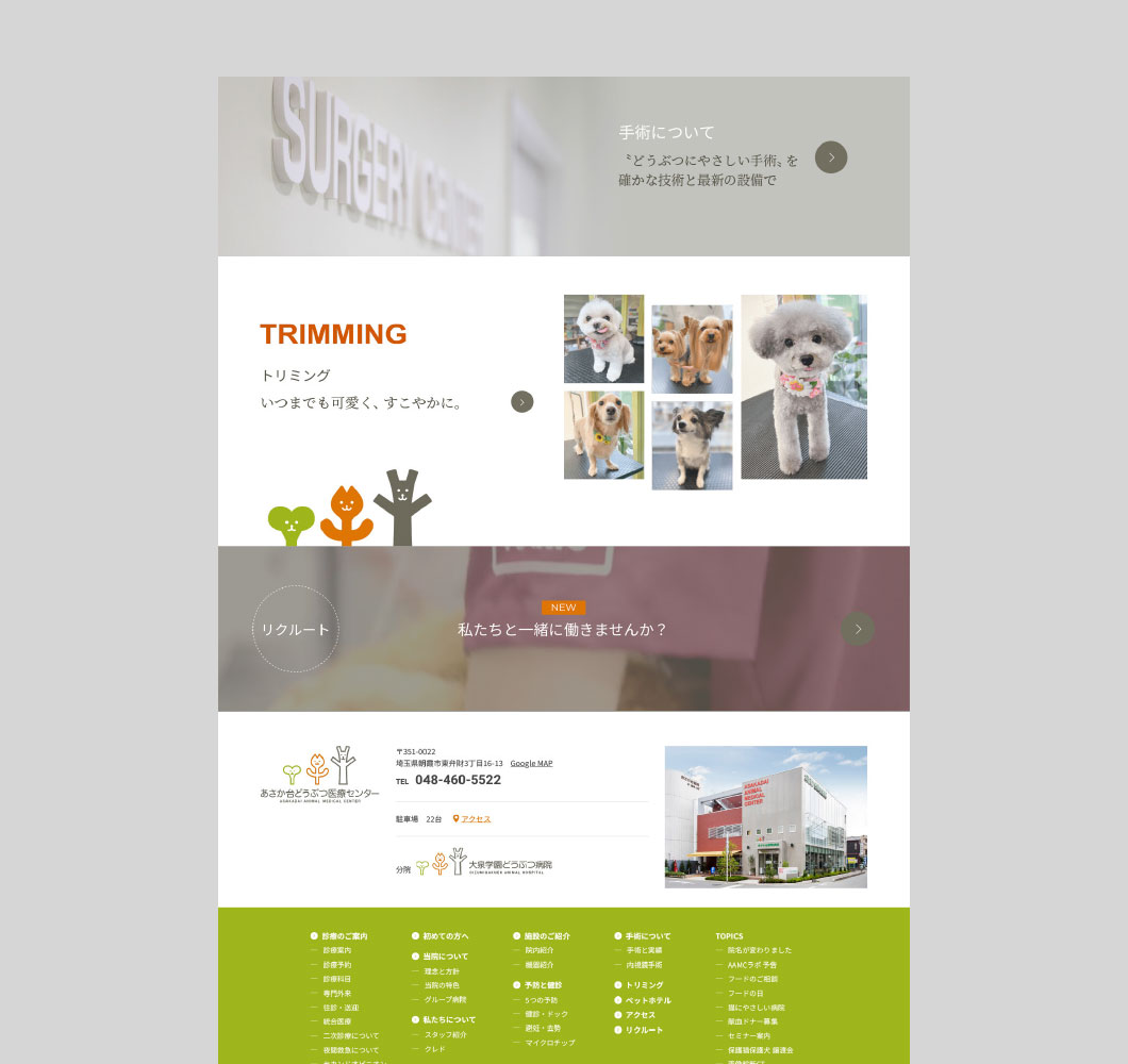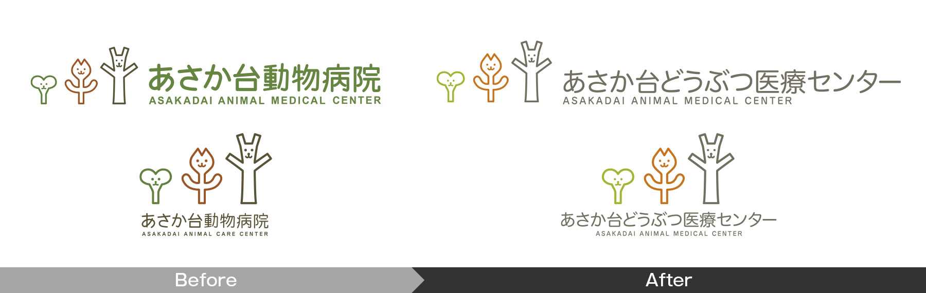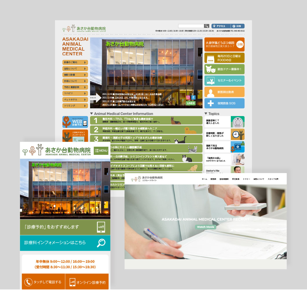 2022年秋の施設名称リニューアル(あさか台動物病院→新名称:あさか台どうぶつ医療センター)に伴い、ロゴマークやウェブデザイン、サイン、各種PRツールをリニューアルしてブランド力を強化するお手伝いをさせていただきました。それまで築いてきたイメージや信頼感を基盤に、近未来の高度医療をイメージさせる明るさと、よりオープンなコミュニケーションを感じさせるデザイン性を取り入れ、グループ病院(AAMCグループ)としてブランディングを重視していく姿勢を打ち出しています。