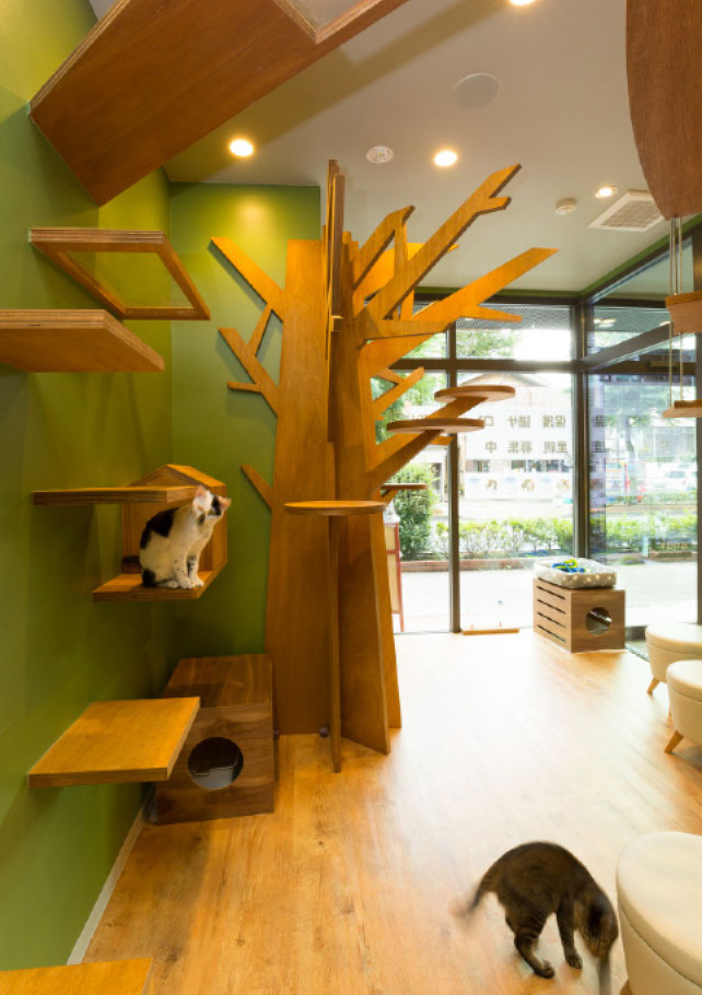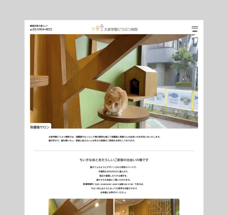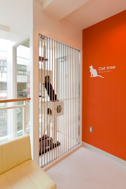 本院同様、診療サービスの絶対的な安心感に加え、保護猫サロンという特色ある空間で、病院という枠組みを超えたコミュニケーションを実現するべく、キャットツリーやウォークで存在感ある施設空間づくりをおこないました。